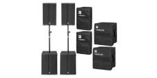 Aktives PA-Komplettset bestehend aus 2x Linear 3 115 FA, 2x Linear Sub 1800 A, 2x K&M Distanzstange und 4 Schutzhüllen