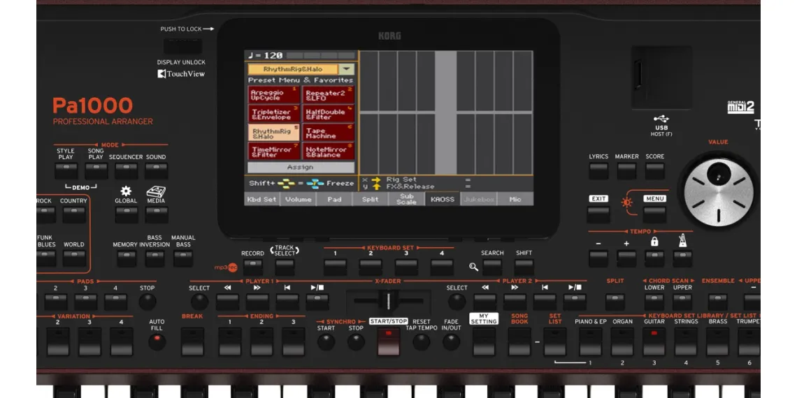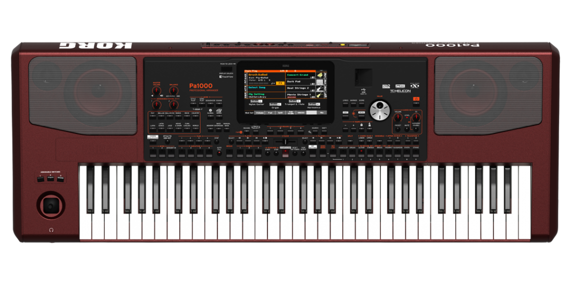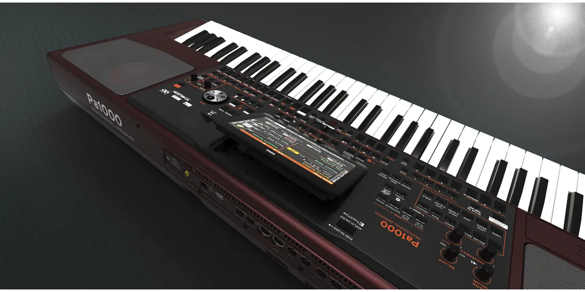 Das Pa1000 liefert mit seiner riesigen Sound- und Style-Vielfalt, einem internen Sampler, und weiteren, innovativen Features die ideale Ausgangsbasis für kreative Performances. Seine über 1.750 hochwertigen Werks-Sounds und die über 430 vorprogrammierten Styles bedienen nahezu jede erdenkliche Musikrichtung. Der integrierte Sampler ermöglicht im Handumdrehen das Erstellen eigener Sounds und Samples und kann auch vorgefertigte Samples laden. Das neu gestaltete, bordeaux-rote Gehäuse beherbergt außerdem ein neu entwickeltes Verstärker- und Lautsprecher-System, das mit satten 2 x 33 Watt Leistung und 4 Lautsprechern in einem Bassreflexgehäuse aufwarten kann.Das neuartige, kapazitive Display lässt sich auf Wunsch anwinkeln und reagiert auf die leichteste Berührung. Der mächtige Doppelsequenzer / -player erlaubt die gleichzeitige Wiedergabe zweier MIDI-Songs oder MP3-Dateien, die mit dem X-Fader ineinander überblendet werden können.Über die Audio-Eingänge lassen sich wahlweise externe Audioquellen, ein Mikrofon und sogar eine Gitarre anschließen. Für Gesang und Gitarre stehen spezialisierte, hochwertige Effekte wie Hall, Chorus und detailliert nachgebildete Gitarrenverstärker bereit. Außerdem ist ein hochwertiger Stimmenprozessor von TC Helicon mit an Bord, der bis zu drei zusätzliche Harmoniestimmen zum eigenen Gesang erzeugen kann.Die neuartige KAOSS FX Funktion ermöglicht es, die gespielten Songs und Styles durch das Berühren des Displays in Echtzeit zu manipulieren. Vom subtilen Überblenden zwischen Variationen und Drum Kit-Typen oder dezentem Mischen der Begleitsounds über das Verbiegen laufender Rhythmen bis hin zu radikalen Verzerrungs-Effekten, Tape Delays und Arpeggios im DJ-Stil bietet diese Funktion vielfältige Möglichkeiten, um das eigene Spiel um professionelle Effekte zu bereichern.