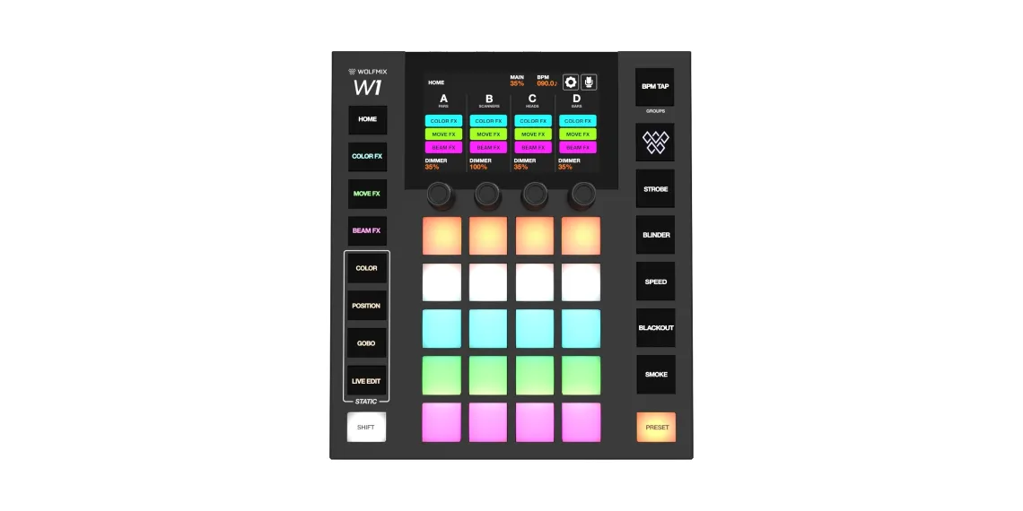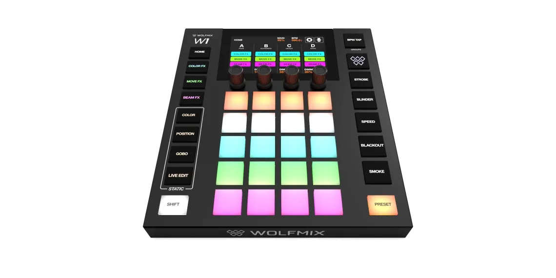 Der Wolfmix W1 MK2 ist ein Standalone-DMX-Lichtcontroller für Live-Auftritte, mit dem sich spontan und ohne Computer spektakuläre Lichtshows erstellen lassen. Er bietet eine Vielzahl an Effektmodulen, Musiksynchronisation und bis zu vier DMX-Universen – alles verpackt in robuster Hardware mit einem leistungsstarken Prozessor.