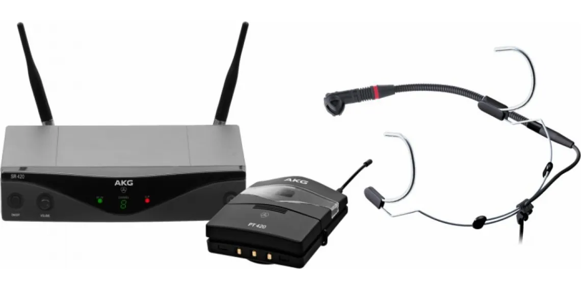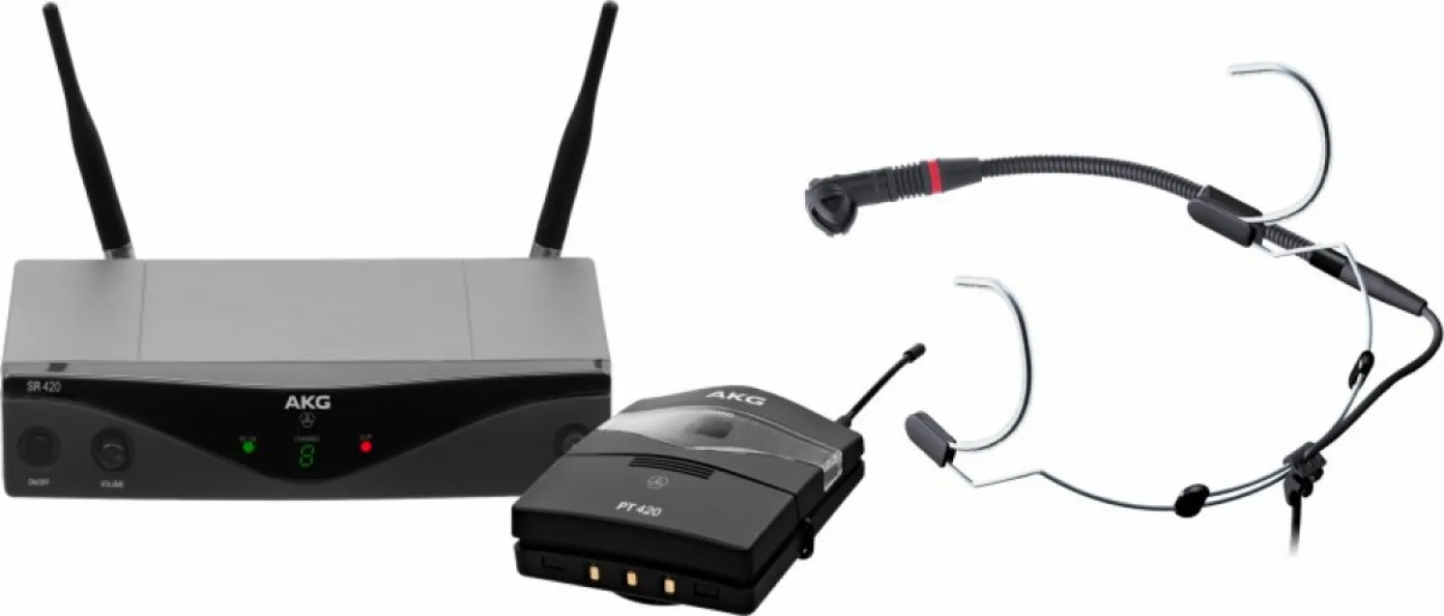 Funksystem für Gesang und Sprache, Taschensender PT420 mit Ladekontakte, Kopfbügelmikrofon C555 L, SR420 Diversity Empfänger, abnehmbare Antennen, 2 Antennen, Netzgerät, Band D: 863,100 - 864,900 MHz