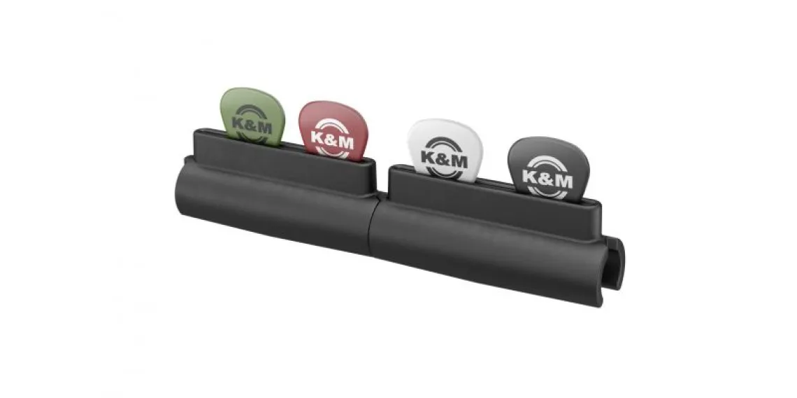 kompakter Plektrumhalter zum Anklippen an Mikrofonstative, bestehend aus zwei Elementen, beliebig erweiterbar, Platz für bis zu 6 Plektren, stapazierfähiger Kunststoff, inkl. 4 Plektren mit der Stärke 0.81