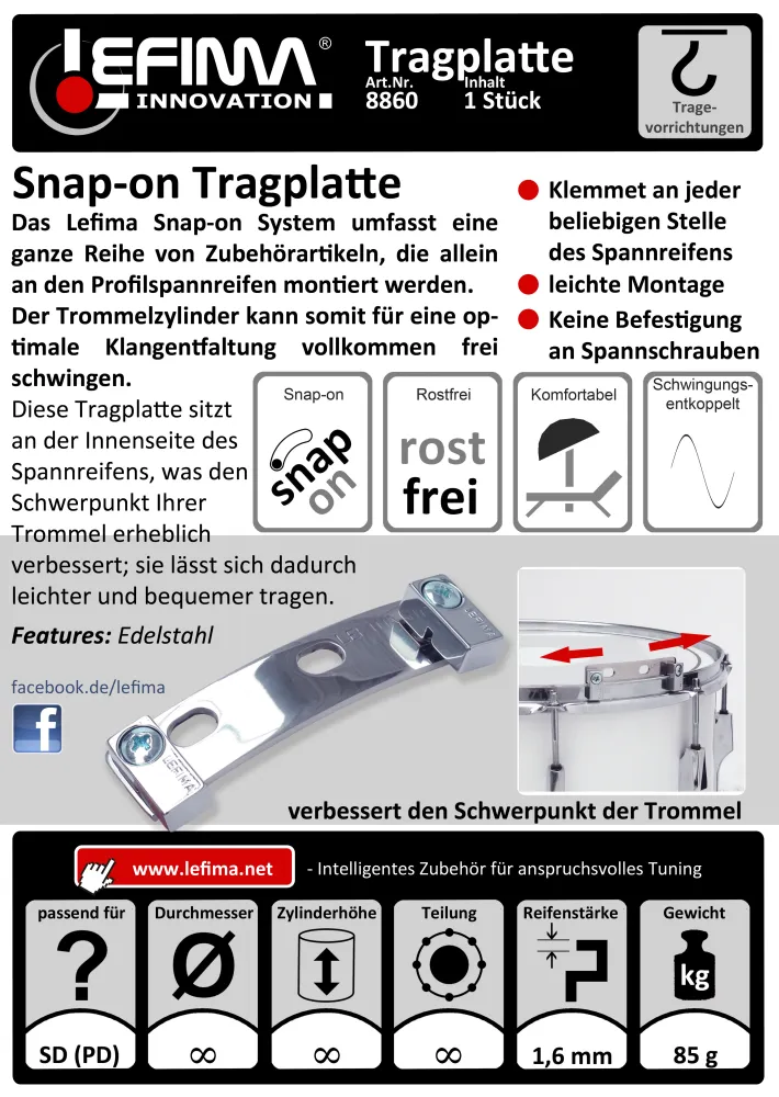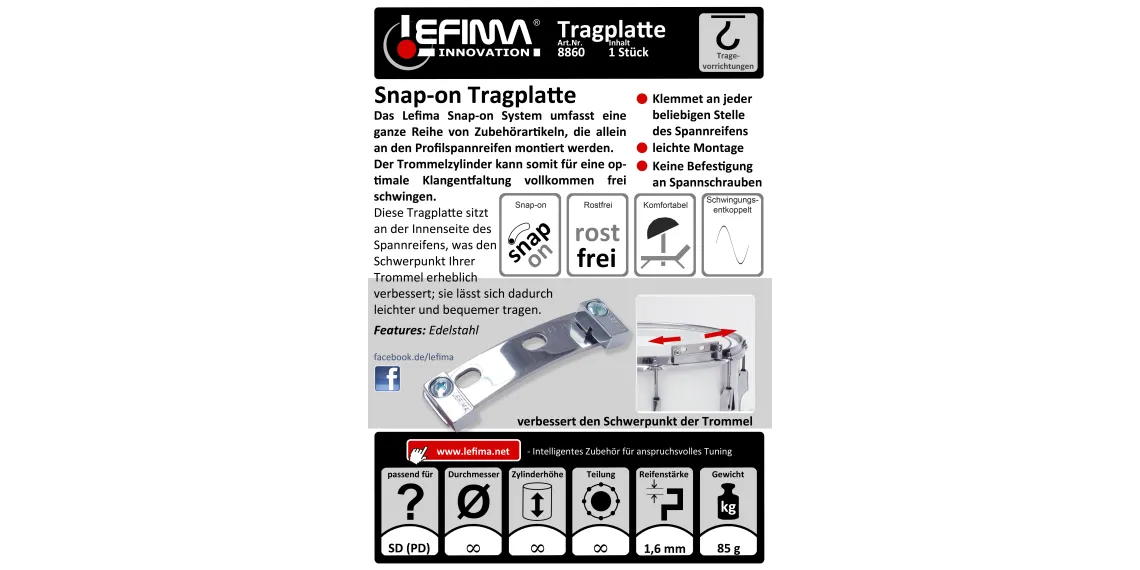 Diese Tragplatte sitzt an der Innenseite des Spannreifens, was den Schwerpunkt Ihrer Trommel erheblich verbessert; sie lässt sich dadurch leichter und bequemer tragen.