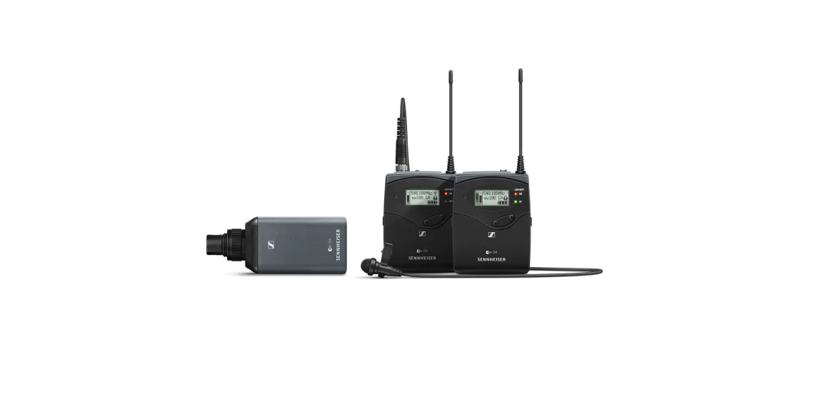 - UHF Wireless Kamera Combi System bestehend aus SK 100 G4 Taschensender, SKP 100 G4 Aufstecksender, ME 2-II Kondensator Lavaliermikrofon mit Kugelcharakteristik undEK 100 G4 Taschenempfänger
