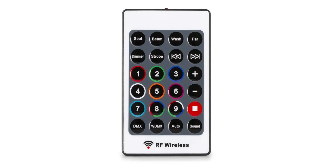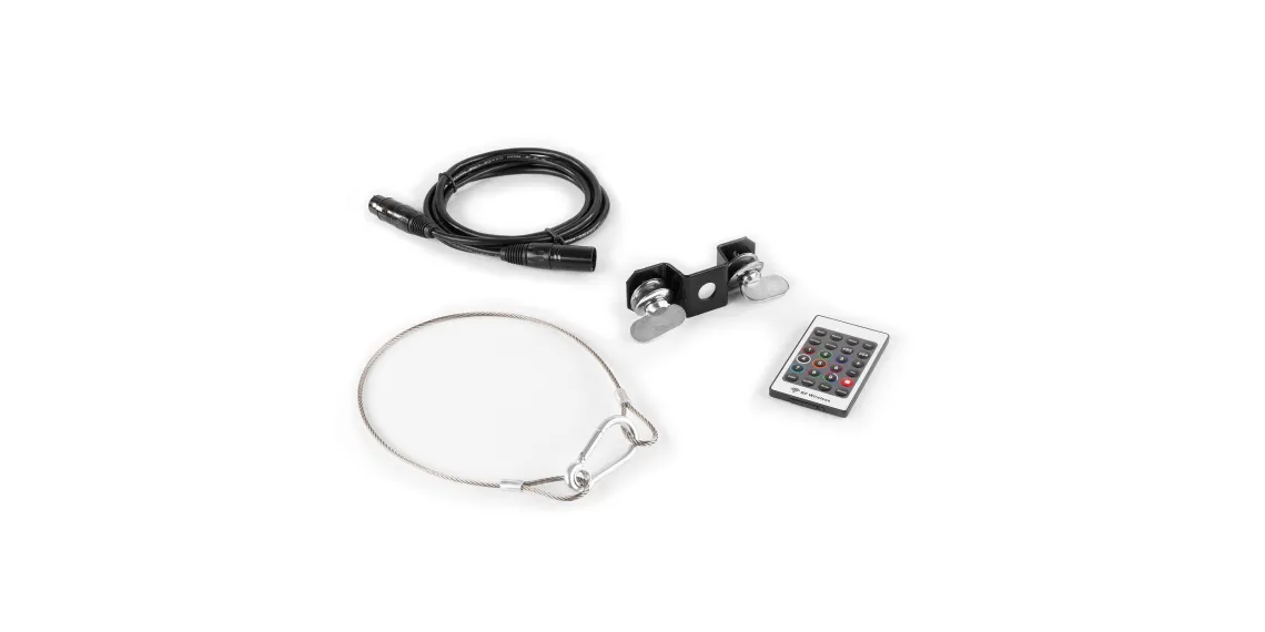 - inkl. 1x Omega-Schnellverschlussklemme, 1x DMX-Kabel, 1x Netzanschlusskabel, 1x Sicherungsseil, 1x Fernbedienung