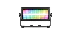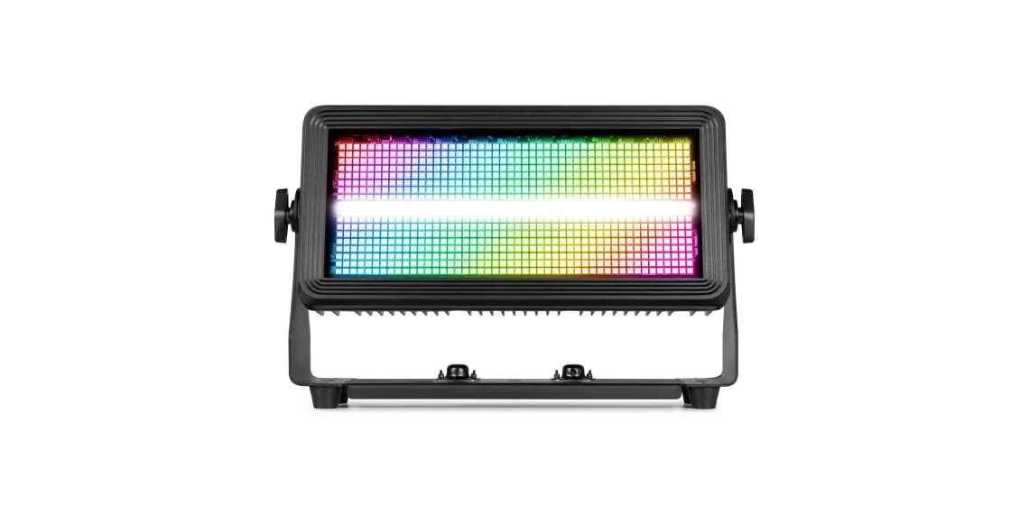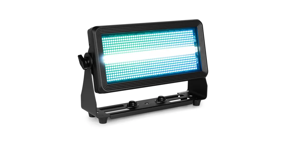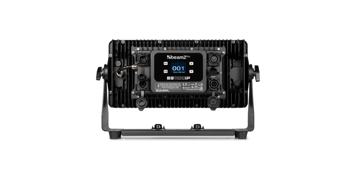 Der BS1100IP ist ein leistungsstarker Multifunktionsscheinwerfer, der dank seiner 768 SMD-LEDs speziell als Stroboskop oder Blinder eingesetzt werden kann. Das LED-Panel ist in 96 Segmente unterteilt und kann dank des RGB-Mischsystems in jeder gewünschten Farbe blinken. Zusätzlich verfügt der Scheinwerfer über einen Streifen mit 128 weißen SMD-LEDs in der Mitte, der in 16 verschiedenen Abschnitten ansteuerbar ist und so den klassischen Stroboskop-Effekt erzeugt. Mit dem BS1100IP lassen sich einzigartige Farbeffekte realisieren. Die Steuerung erfolgt einfach per DMX oder im Standalone-Modus mit Automatikfunktion. Staub- und wasserbeständig (Schutzart IP65) garantiert zuverlässigen Betrieb bei jedem Wetter. Geeignet für alle Arten von Indoor- und Outdoor-Shows und -Events.