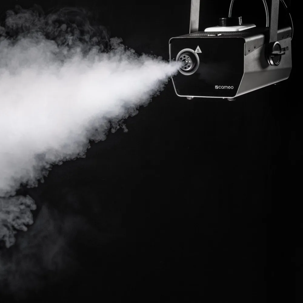 Über eine Funkfernbedienung oder Kabelfernbedienung lässt sich der Nebelausstoß auch aus der Entfernung ein- und ausschalten. An den Geldbeutel wie auch an die Umwelt ist gedacht, denn der Einsatz erfolgt wirtschaftlich und umweltfreundlich unter Verwendung herkömmlichen Nebel-Fluids auf Wasserbasis (z.B. Cameo DJ Fluid). Der herausnehmbare Fluid-Behälter erleichtert das Nachfüllen. Ein toller Effekt für den Bediener selbst ist die Beleuchtung des Fluid-Behälters von innen, um auch im Dunkeln stets den Füllstand des Fluids im Auge behalten zu können. Der integrierte Überhitzungsschutz verlängert die Lebensdauer des Geräts und steigert die Betriebssicherheit gleichermaßen. Mit der integrierten Kabelöse zum Anschlagen eines Sicherheitsfangkabels ist die Montage in der Höhe und über Kopf unter Einhaltung der gebotenen Sicherheitsvorkehrungen problemlos möglich.