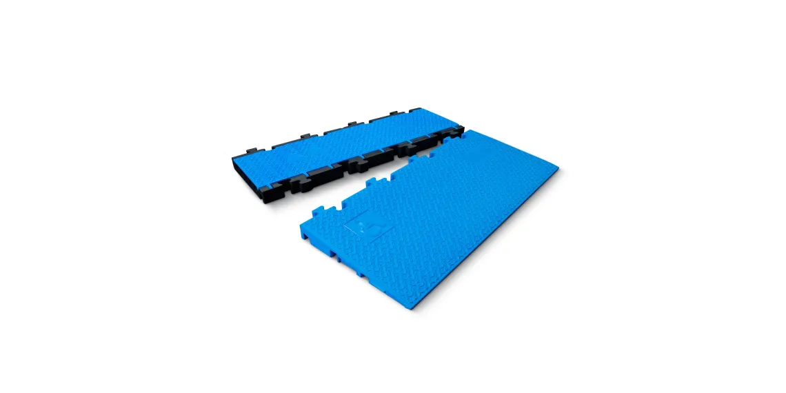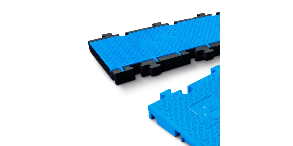 - Hochbelastbare Allround-Kabelbrücke mit 3D-Lasergrip Anti-Rutsch-Oberfläche aus blauem, recyceltem Polyurethan und patentiertem selbst reinigendem Deckel-Scharnier