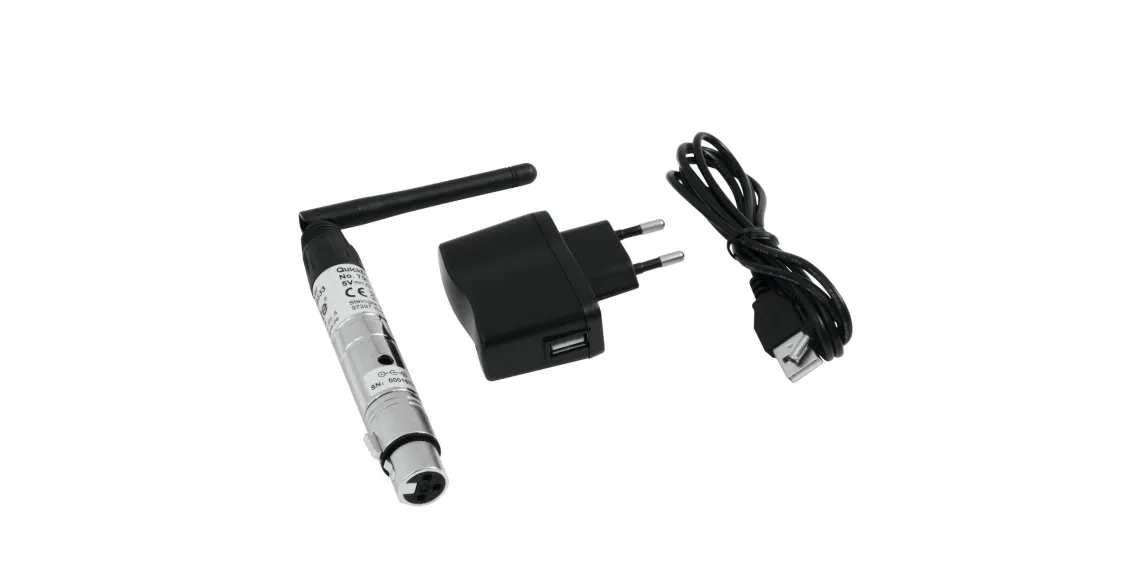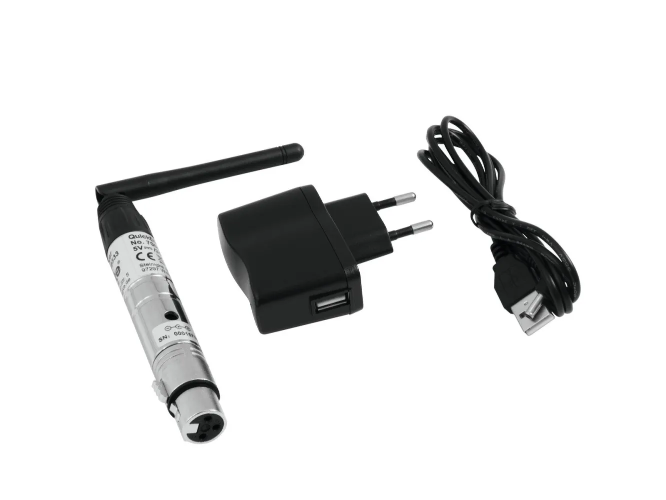 Mit Drahtlos-DMX entfällt die aufwändige Verkabelung zwischen DMX-Controller und den DMX-gesteuerten Geräten in Lichtanlagen - Durch GFSK-Modulation mit 78 Kanälen störungsfreier Betrieb auch neben weiteren QuickDMX-Transceiver und anderen Drahtlos-Geräten im 2,4-GHz-Band (wie z. B. W-LAN und Bluetooth)