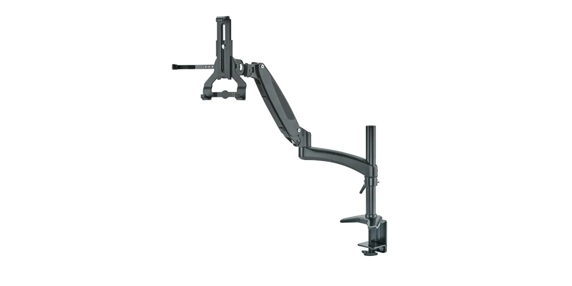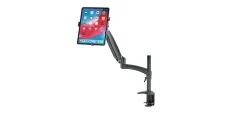 Selbstverständlich kann der Tablet Halter zwischen Hoch- und Querformat kurzerhand gedreht werden, wobei ein selbstständiges Drehen verhindert wird. Für eine nackenschonende Haltung und einen perfekten Blickwinkel kann der Tablet-Halter stufenlos geneigt, gedreht und geschwenkt werden. Dank der großen stabilen Tischklemme (bis 85 mm Dicke) ist die komplette Halterung schnell montiert und flexibel einsetzbar. Hier ist eine Höhenverstellung bis zu 200 mm möglich. Der obere Arm bietet zusätzlich 350 mm an Höhenverstellbarkeit. Die integrierte Kabelführung sorgt außerdem für einen aufgeräumten und professionellen Eindruck.