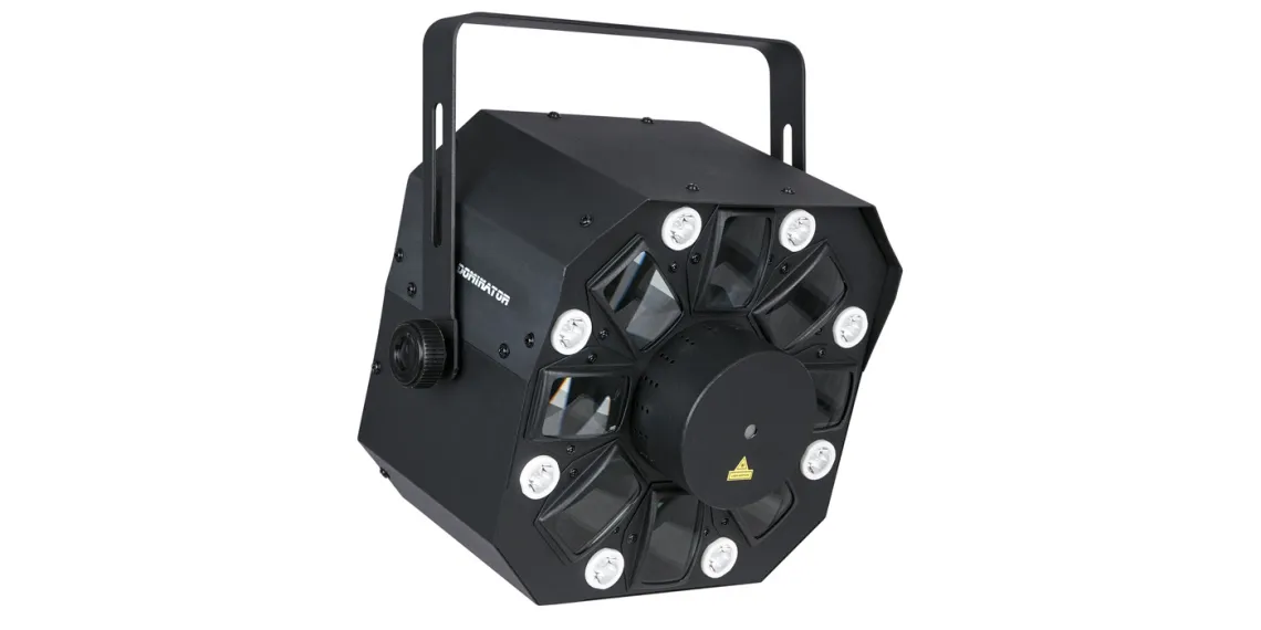 Der Showtec Dominator ist ein 3-in-1-Effektstrahler mit 8 leistungsstarken weißen Blitz-LEDs, einem 200mW-RG-Lasermodul und einem RGBWA-LED-Lichteffekt mit einer Leistung von 3 Watt. Alle 3 Effekte können separat im automatischen oder musikgetakteten Modus abgespielt werden. Er kann auch über DMX angesteuert und somit vollständig kontrolliert werden. Der RG-Laser ist mit zahlreichen vielseitigen Gitter- und Bursteffekten ausgestattet und verfügt über eine Schlüsselverriegelung und einen Remote-Notausschalter. Das Stroboskop besteht aus 8 Sektionen mit unterschiedlichen vorprogrammierten Mustern. Alle RGBWA-Farben können einzeln oder in zahlreichen vorprogrammierten Kombinationen angesteuert werden. Mit mehreren Dominators können Sie mit dem Master/Slave-Modus eine synchronisierte Lichtshow erstellen. Wenn Sie nach einer Lösung suchen, die eine Stroboskopfunktion, einen Laser und farbige LED-Lichteffekte in sich vereint und auch noch vollständig ansteuerbar ist, ist der Showtec Dominator das, wonach Sie suchen.