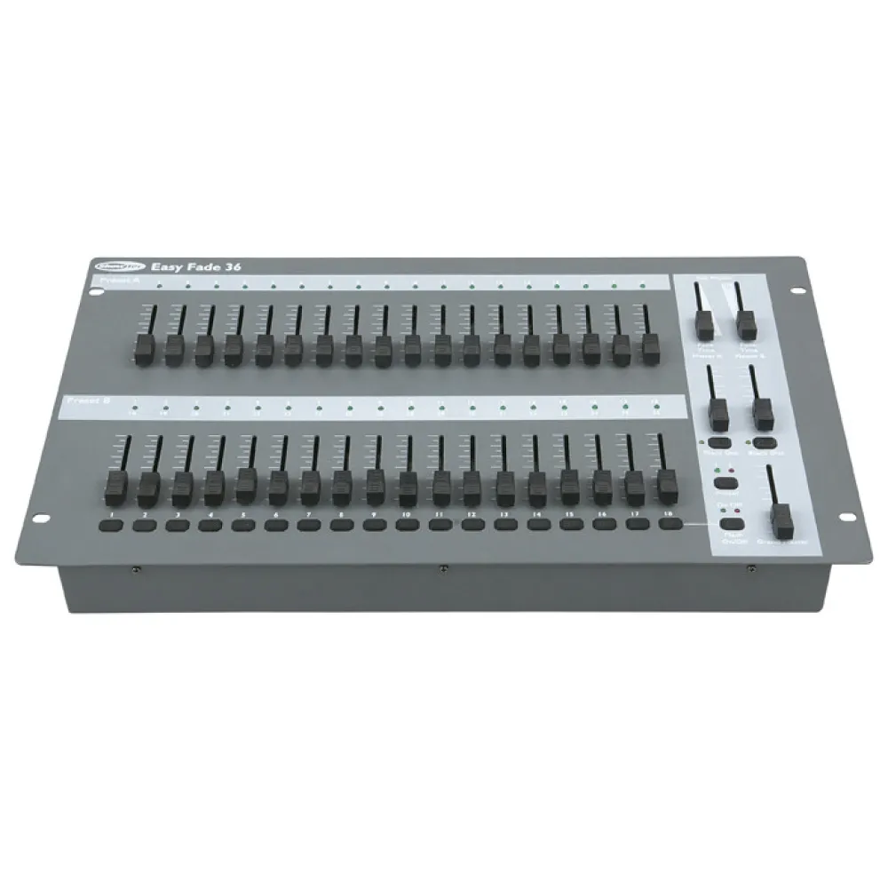 Das Easy Fade 36 ist ein Double-Preset-Mischpult mit zwei Gruppen à achtzehn Kanälen. Das Mischpult kann entweder als Double-Preset-Mischpult mit achtzehn Kanälen oder als Single-Preset-Mischpult mit sechsunddreißig Kanälen genutzt werden.
