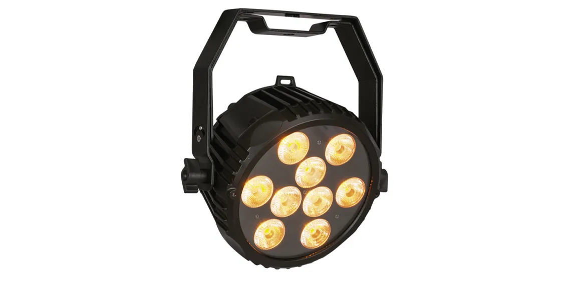 Der Showtec Power Spot 9 Q6 Tour ist ein 9 x 10 Watt RGBWA + UV-LED-Spot mit leisem Betrieb und ohne Flackern, geeignet für Indoor-Veranstaltungen. Dieser Scheinwerfer verfügt über einen ProPower und einen 3- und 5-poligen DMX-Anschluss.