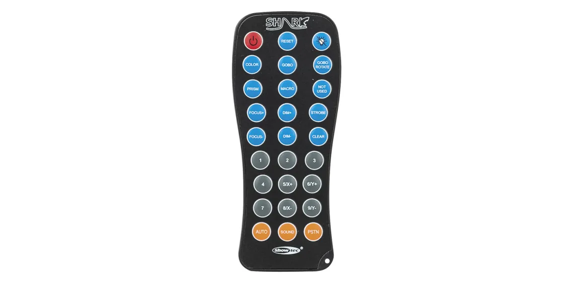Zusätzlich enthält der Shark Spot One eine Infrarot-Fernbedienung für die drahtlose Steuerung von Point-and-Shoot-Effekten. Mit einem einzigen Tastendruck können Sie automatische und tonaktivierte Programme sowie alle anderen verfügbaren Funktionen und Effekte aktivieren.